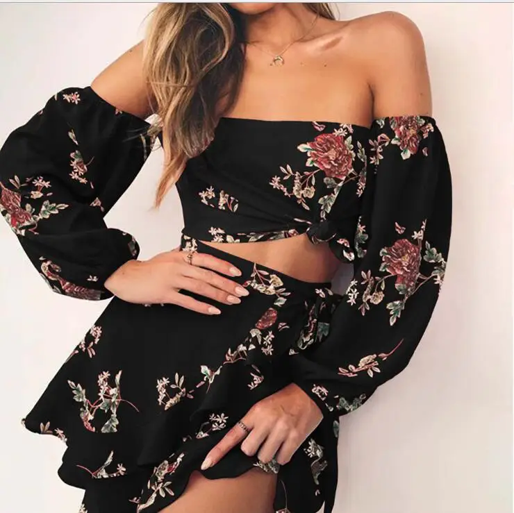 Sale 2020 New Hot Summer 2 Two Piece Set Women Sexy Off Shoulder Ruffles Tops Skirts Set Floral Print Female Casual Holiday Outfits