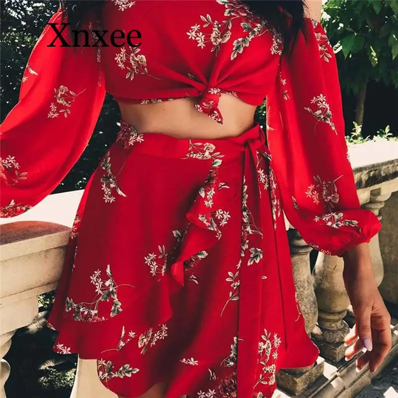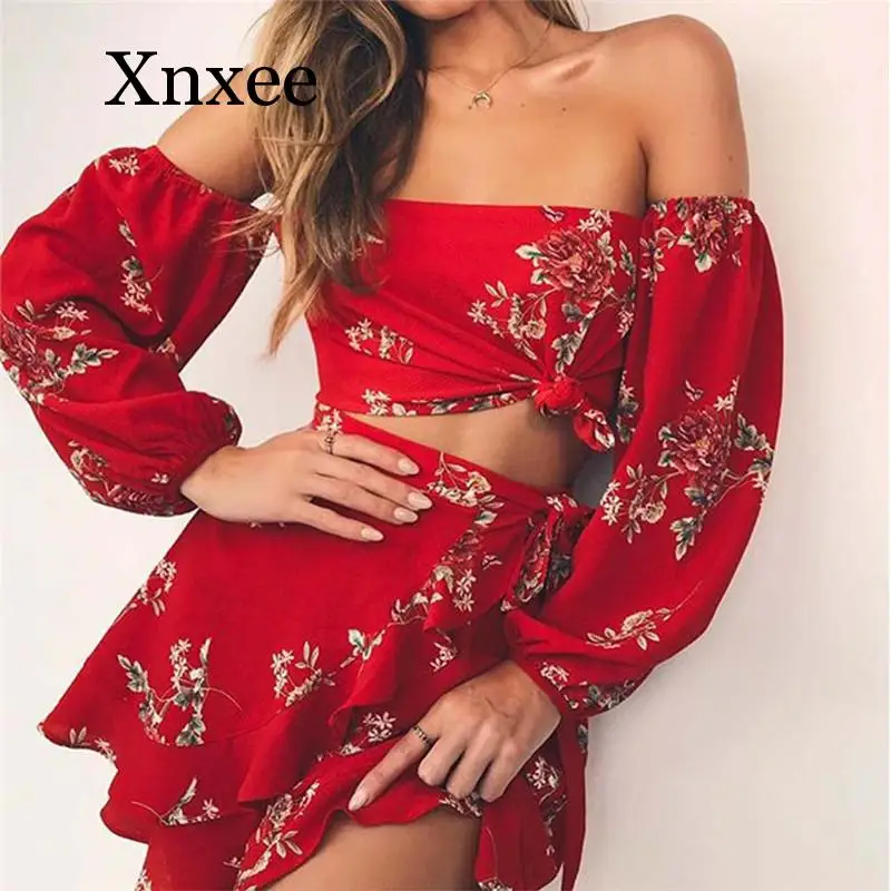 Buy 2020 New Hot Summer 2 Two Piece Set Women Sexy Off Shoulder Ruffles Tops Skirts Set Floral Print Female Casual Holiday Outfits