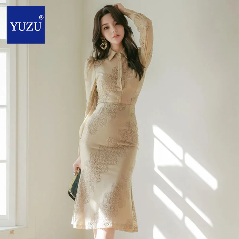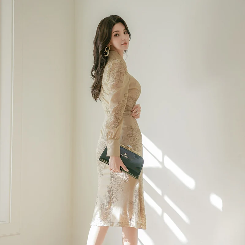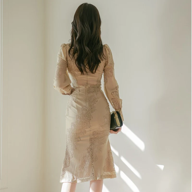 Get this 2 Piece Set Apricot Lace See Through Crop Top Long Sleeve Turn-down Collar Single Breasted Lace Crochet Flower Calf-length Skirt with limited time discount by pressing the button below