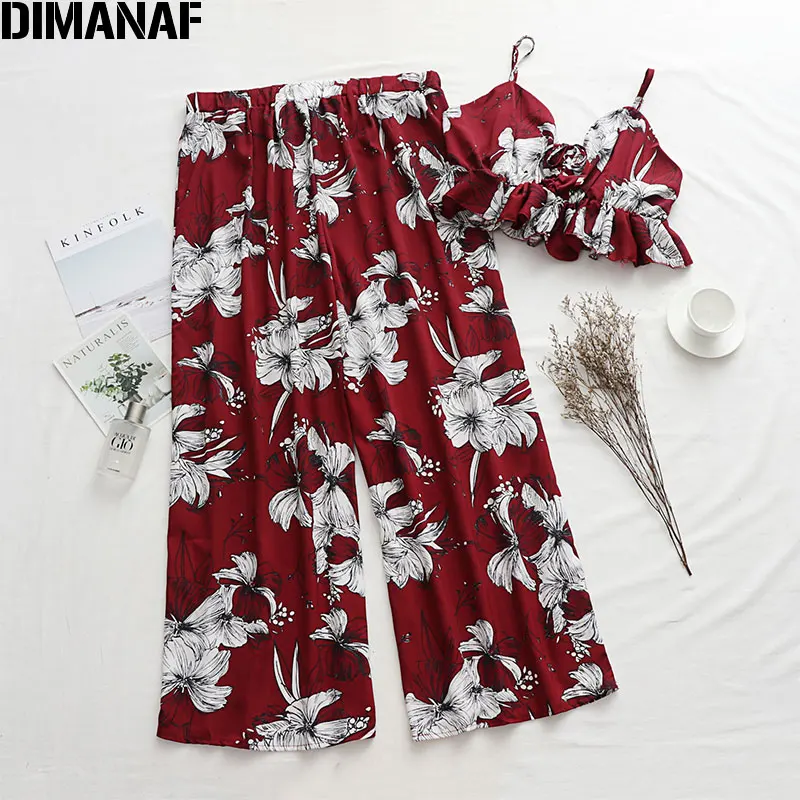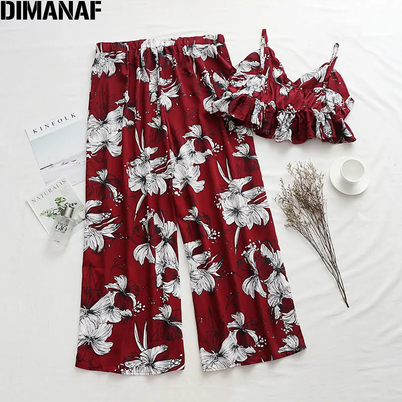 Best Offer DIMANAF Plus Size Women Sets Suits Summer Holiday Beach Style Sexy Lady Tops Long Pants Loose Casual Oversize Print Floral 2020