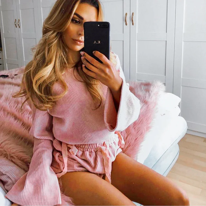 New New summer Pink Corduroy Pink Two Piece Set Top and Pants Women Clothing 2020 Cute Casual Outfits Short Matching Sets Sweet