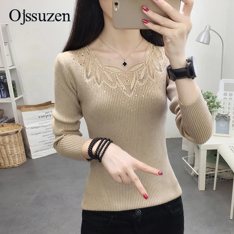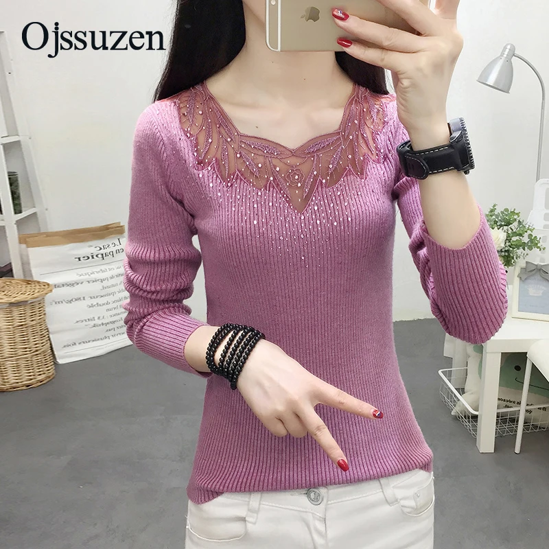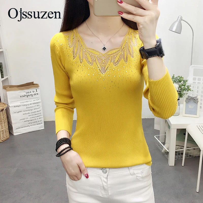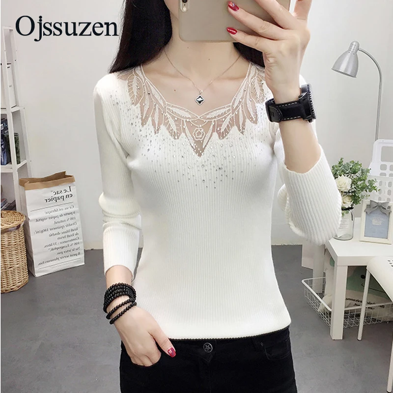 Best Offer Sexy Lace White Sweater Womens Pullovers Diamond Spring Autumn Clothes Woman's Sweaters Blue Tops Female Knitting Jumper