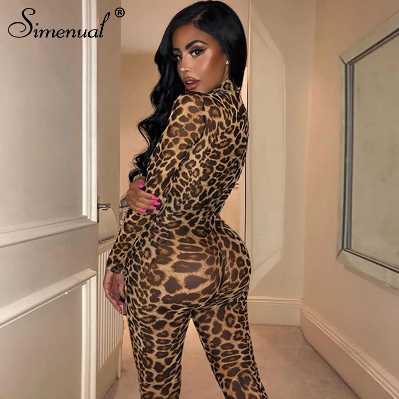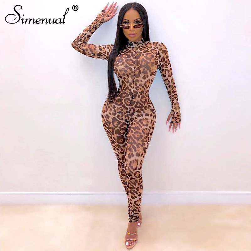 Buy Simenual Leopard Sexy Mesh Transparent Rompers Womens Jumpsuit Party Hot Long Sleeve Fashion 2019 Skinny Zipper Jumpsuit Fitness