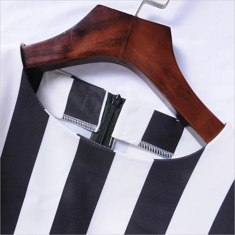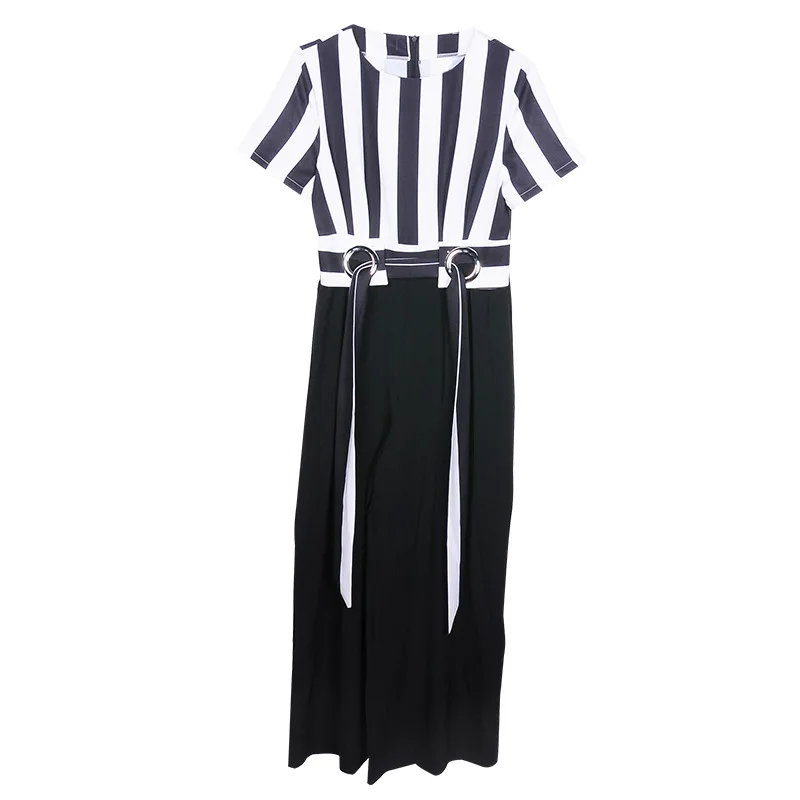 Sale Summer 2020 new women round collar black and white stripes bow tie belt waist fashion stitching jumpsuit