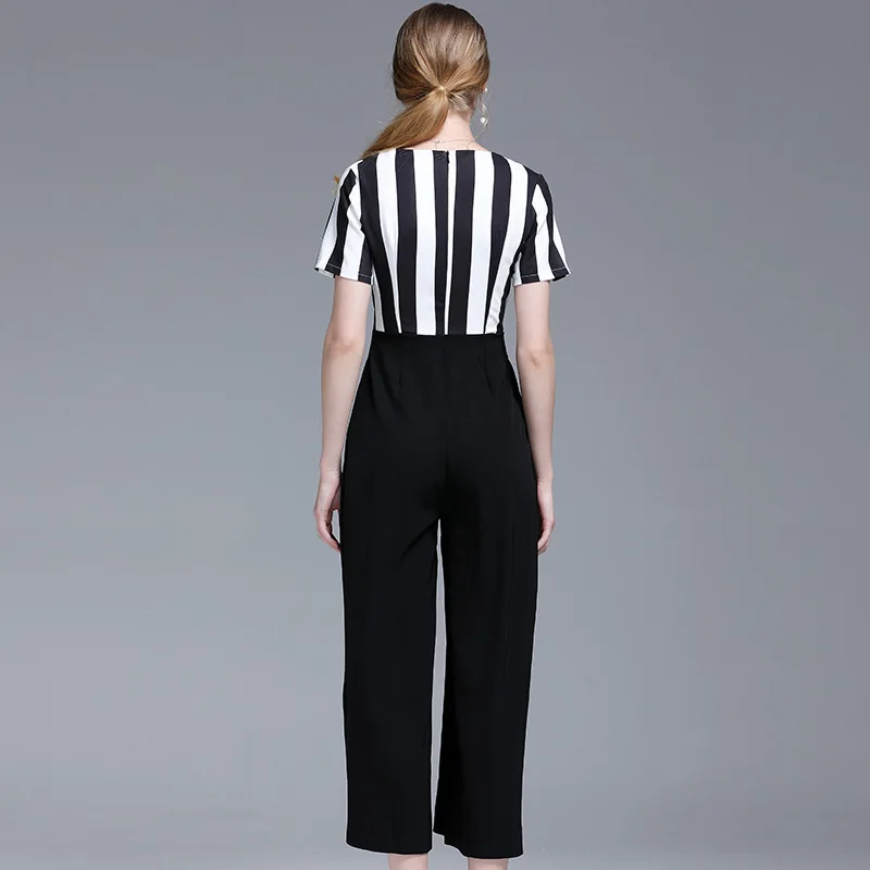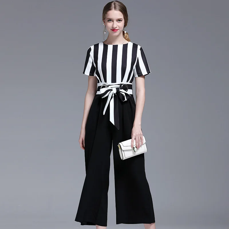 Get this Summer 2020 new women round collar black and white stripes bow tie belt waist fashion stitching jumpsuit with limited time discount by pressing the button below