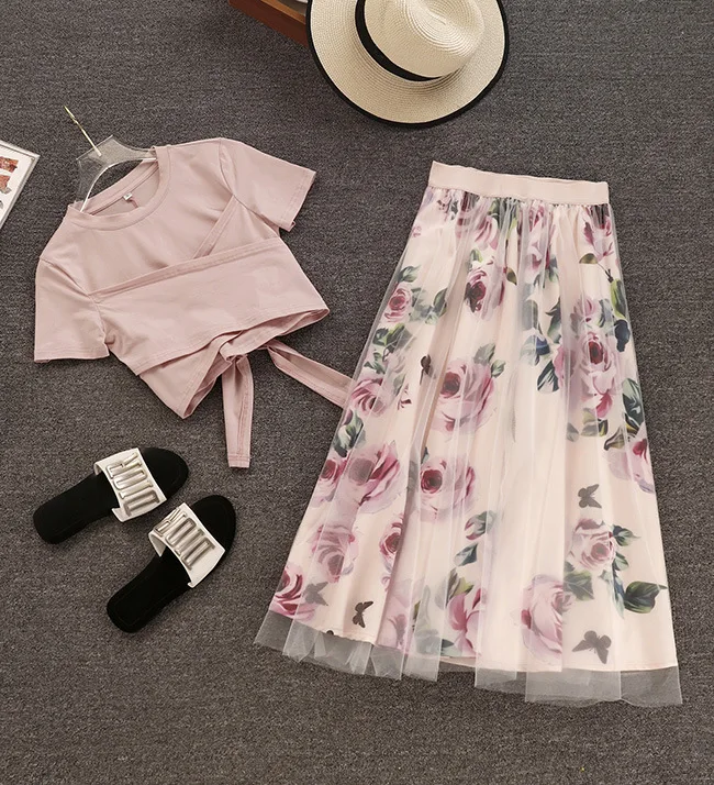 Get this 2020 New Runway Sweet Women Print Fashion Bandage Cross Cotton Blouses Tops + Long Midi A-line Skirts 2pcs set Suit Dresses with limited time discount by pressing the button below