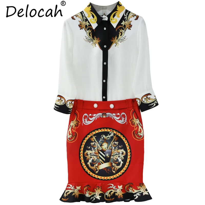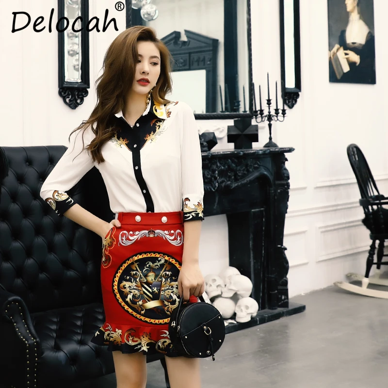 New Delocah Women Summer Suits Runway Fashion Designer 3/4 Sleeve Shirt and Character Printed Elegant Vintage Skirt Two Pieces Set
