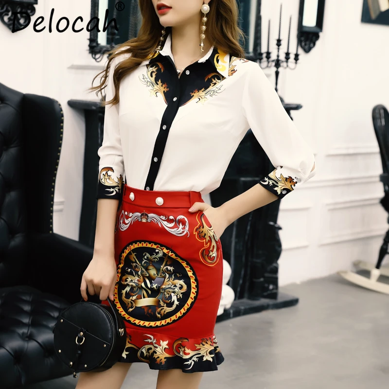 Get this Delocah Women Summer Suits Runway Fashion Designer 3/4 Sleeve Shirt and Character Printed Elegant Vintage Skirt Two Pieces Set with limited time discount by pressing the button below