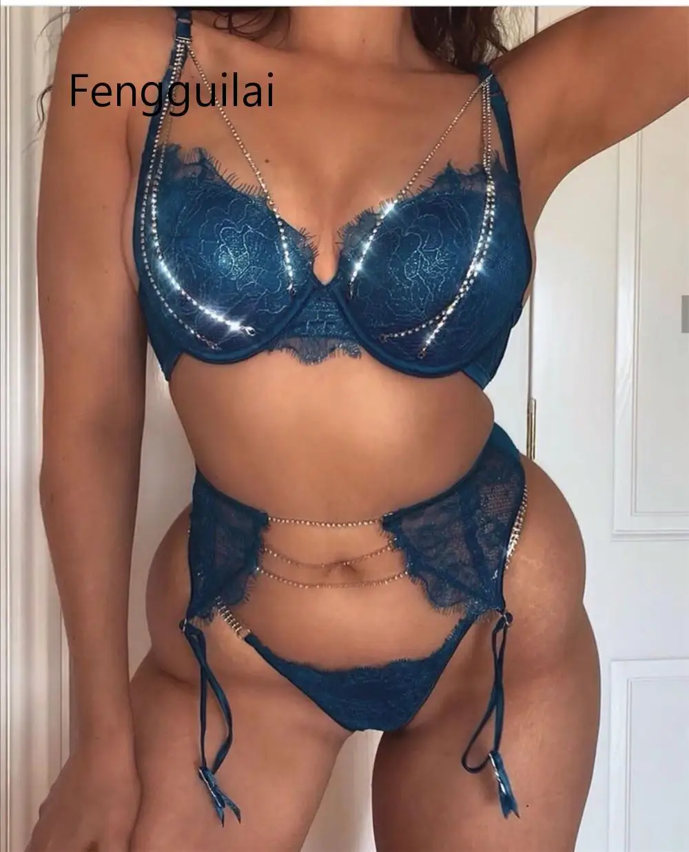 New FENGGUILAI 2020 Luxurious Crystal Chain Sexy Bodysuit Women 3 Piece Set Hollow Out Lace Bodysuit Jumpsuit Night Party Set