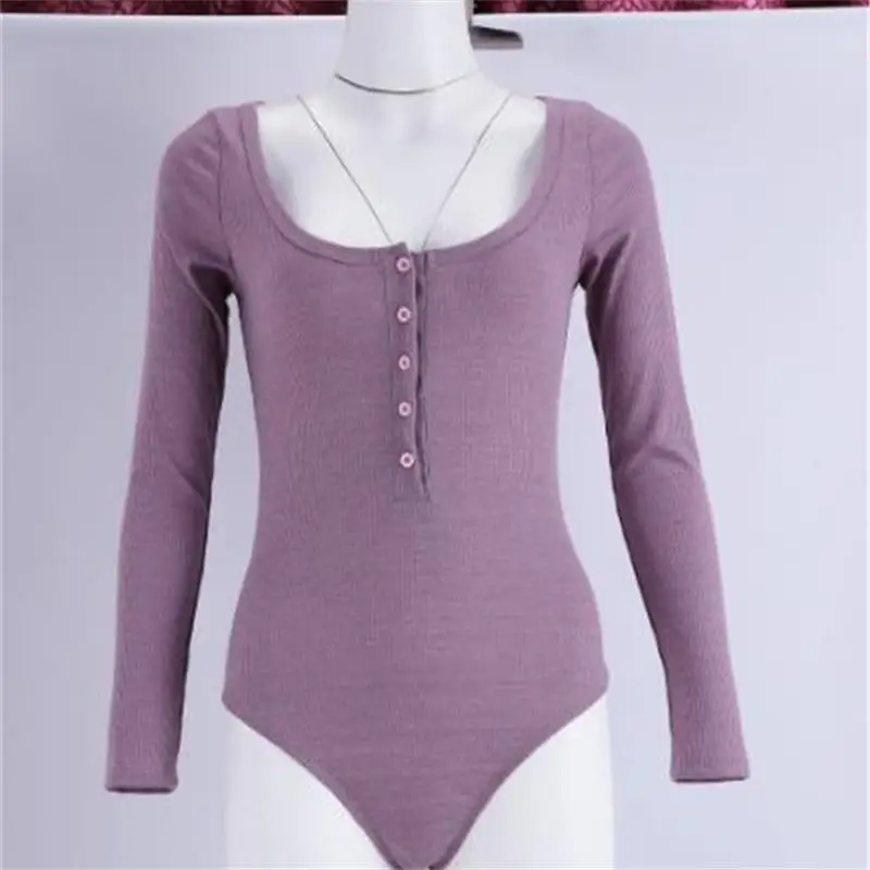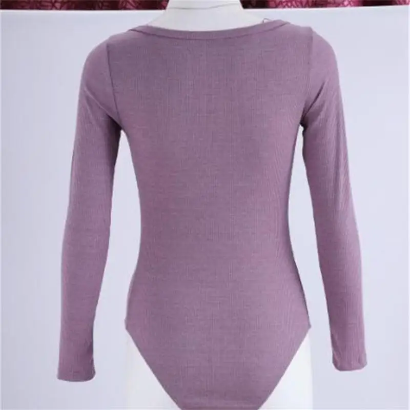 New InstaHot Knitted Boat Neck Bodysuit Long Sleeve Slim Button Skinny Basic Top Women Romper Purple Casual Office Lady Body Autumn