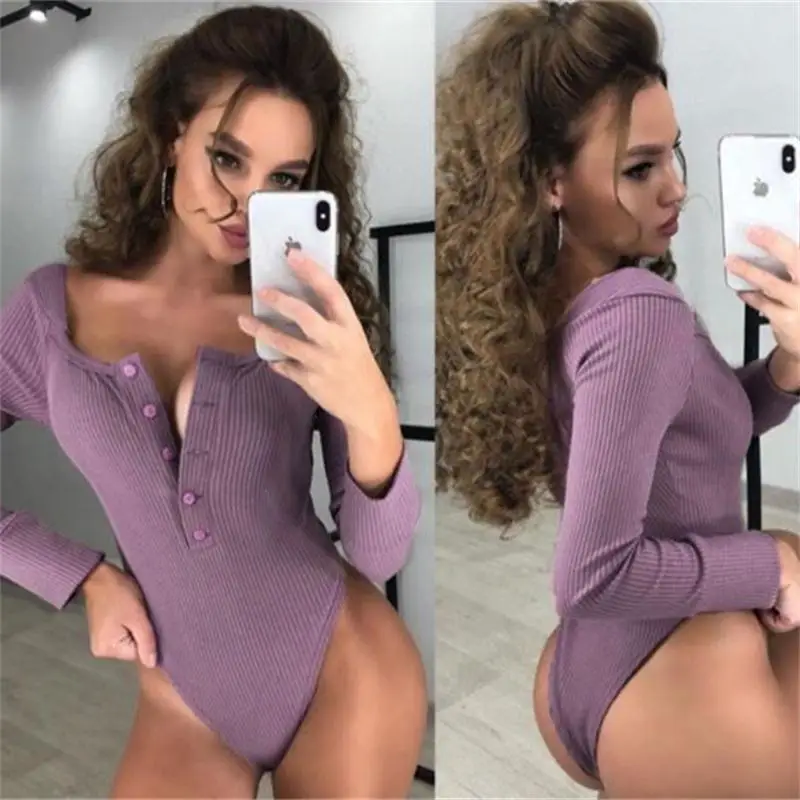 Get this InstaHot Knitted Boat Neck Bodysuit Long Sleeve Slim Button Skinny Basic Top Women Romper Purple Casual Office Lady Body Autumn with limited time discount by pressing the button below