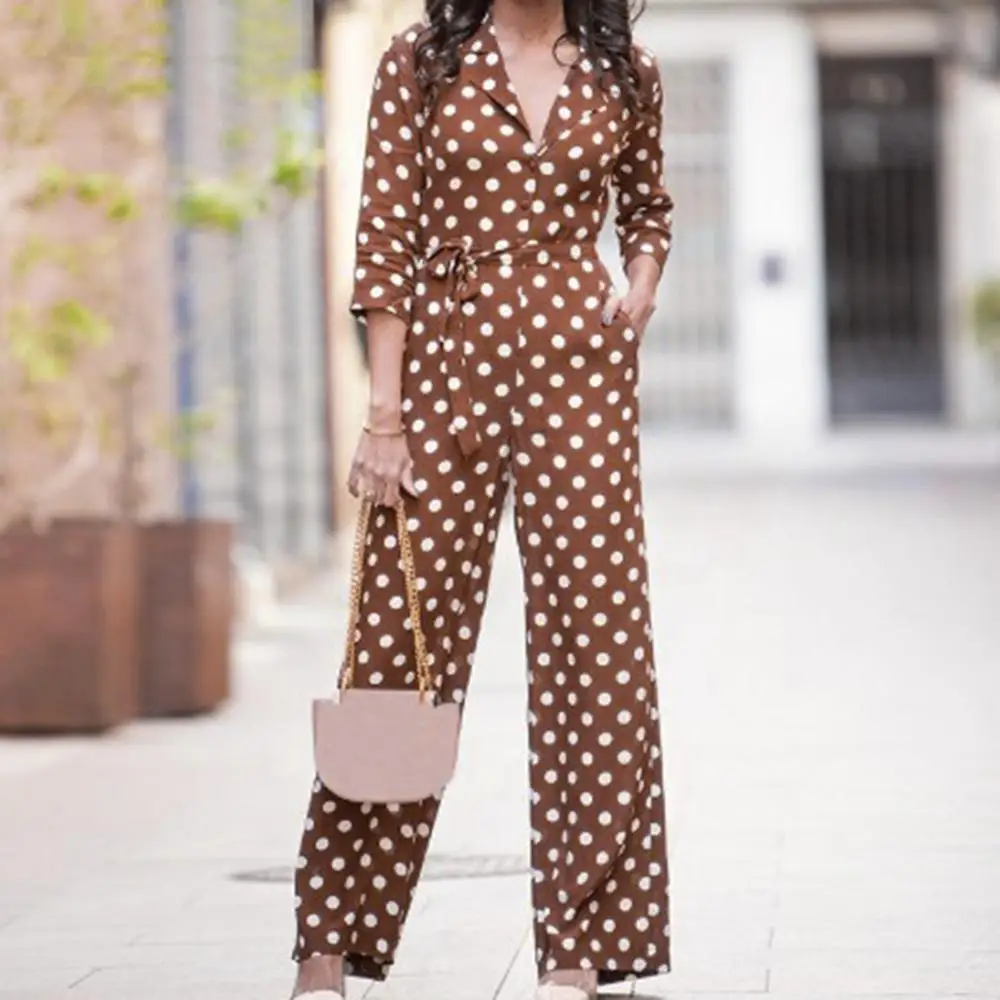 New Boho Rompers Womens Jumpsuit Dot Long Sleeve Lapel Jumpsuit With Belt Lace Up Overalls For Ladies Ropa Mujer 2020 Winter Spring