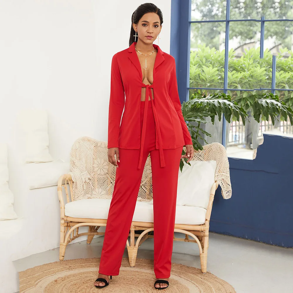 New Two Piece Sets Office Women Set Lace Up Blazer Coat Casual Pants Formal Business Suit White Blue White African Fashion Outfits