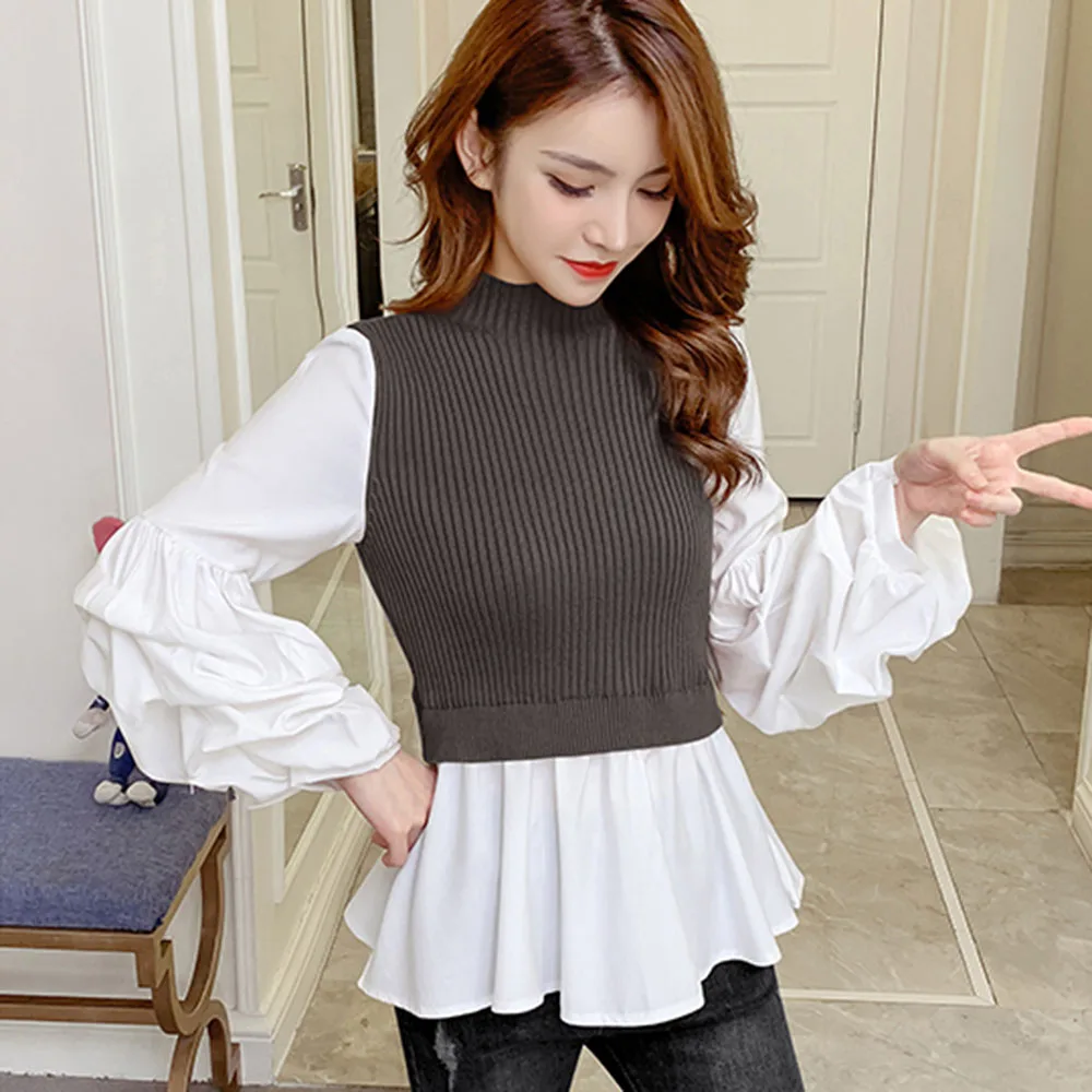 Best Offer 2020 Spring Long Sleeve Blouse Korean Office Ladies Elegant Chic Fake Two Piece Patchwork Shirts Causal Femele Tops Black/Gray