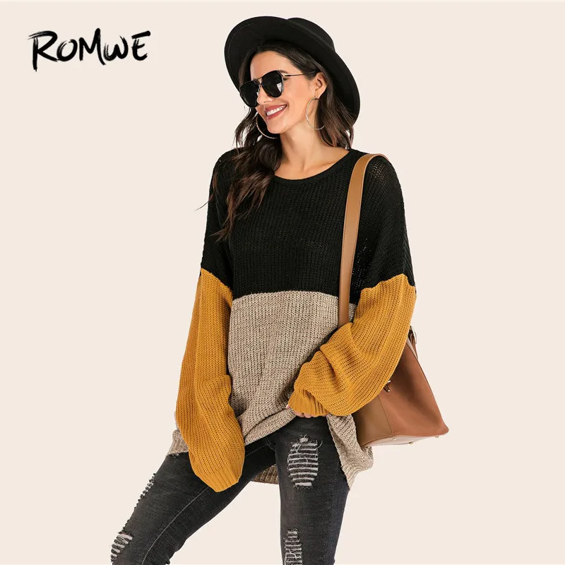 Best Offer ROMWE Color-Block Drop Shoulder Oversized Sweater Women Casual Long Sleeve Knit Jumper Spring Long Sweater Womens Sweaters