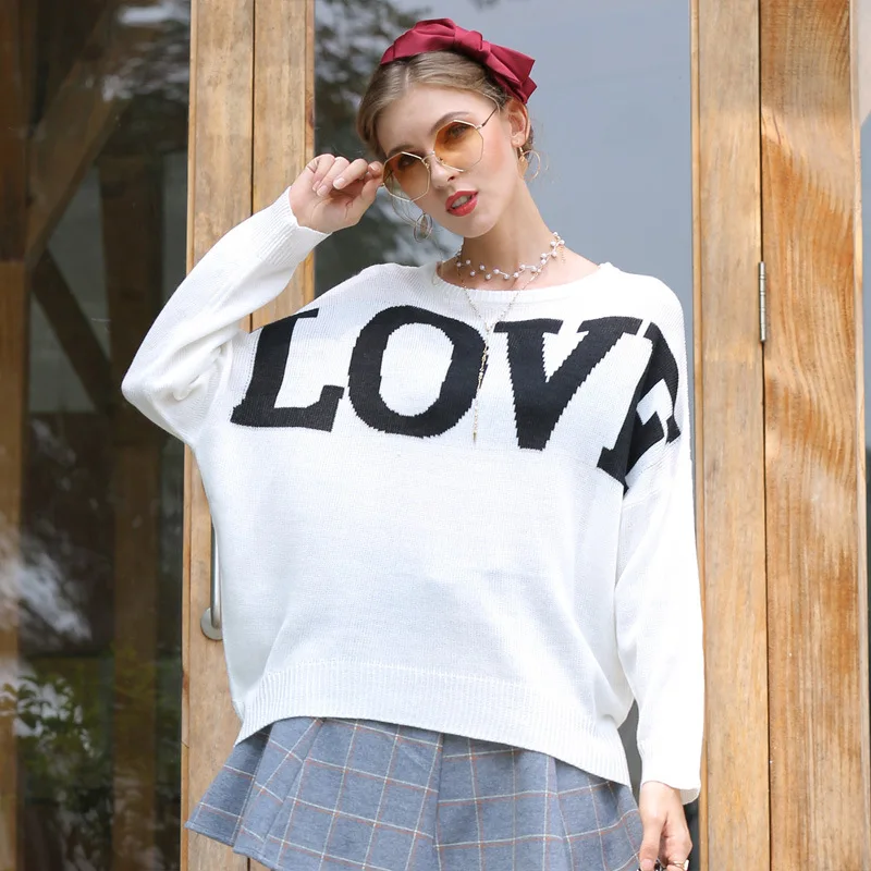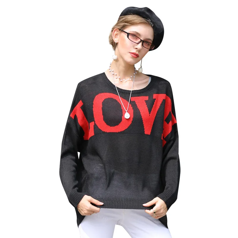 Buy Women Oversized Sweater and Pullovers O-neck Sweet Love Letters Printed Pull Jumpers Long Sleeve Black Streetwear Knit Tops
