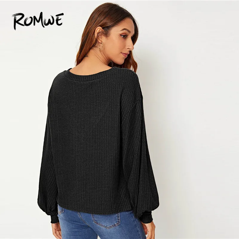 Sale ROMWE Bishop Sleeve Solid V Neck Sweater Korean Style Women Long Sleeve Sweaters 2019 Winter Autumn Casual Jumper Black Tops