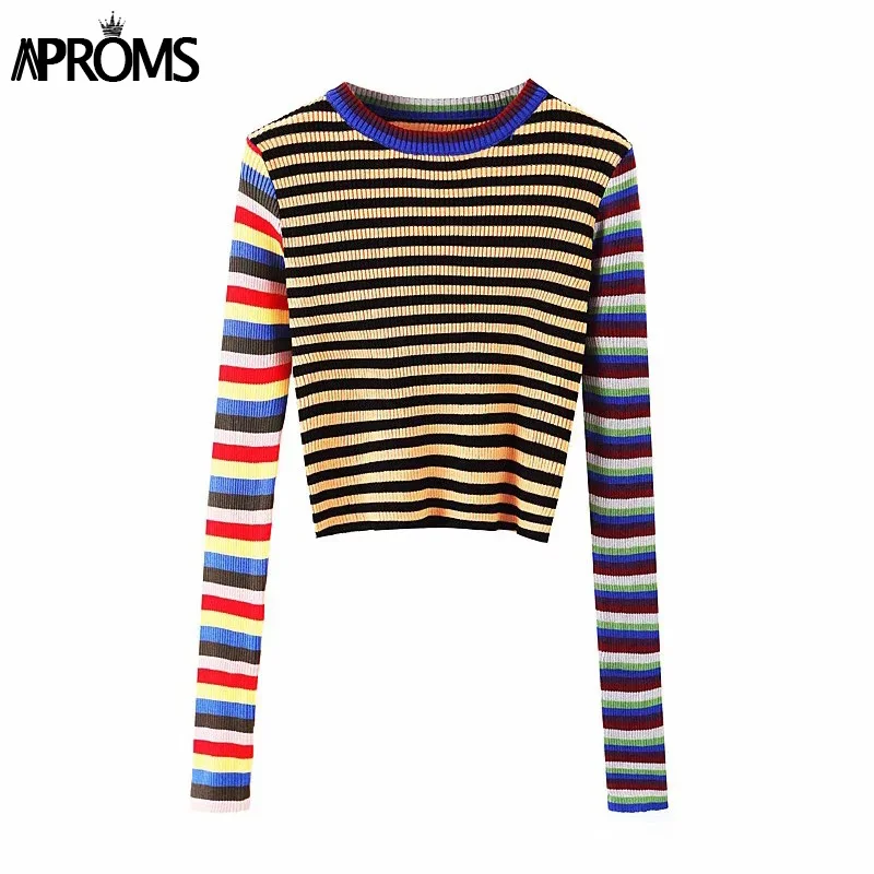 Promo Aproms Colorful Striped Ribbed Knitted Sweater Women Cropped Pullovers Spring Streetwear Long Sleeve Soft Stretch Short Top 2020