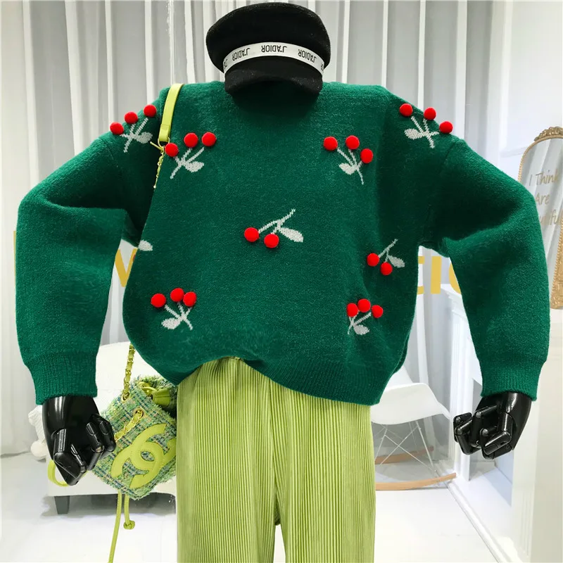 Sale Cherry Appliques Women Sweater and Pullovers 2019 Autumn Winter O-Neck Sweet Women's Free Knitted Sweater new items