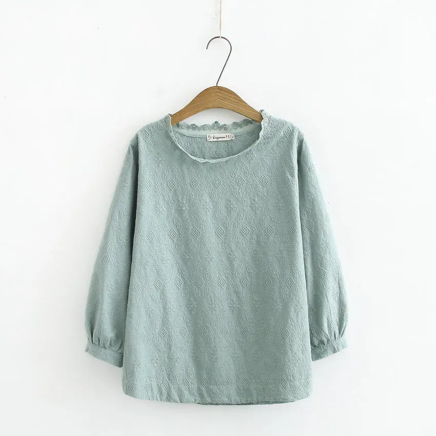 New Woman Lace Hem Collar Design Blouse Spring Autumn Jacquard Weave Cotton Round Collar Long Sleeve Daily Tops For Girls Blouses