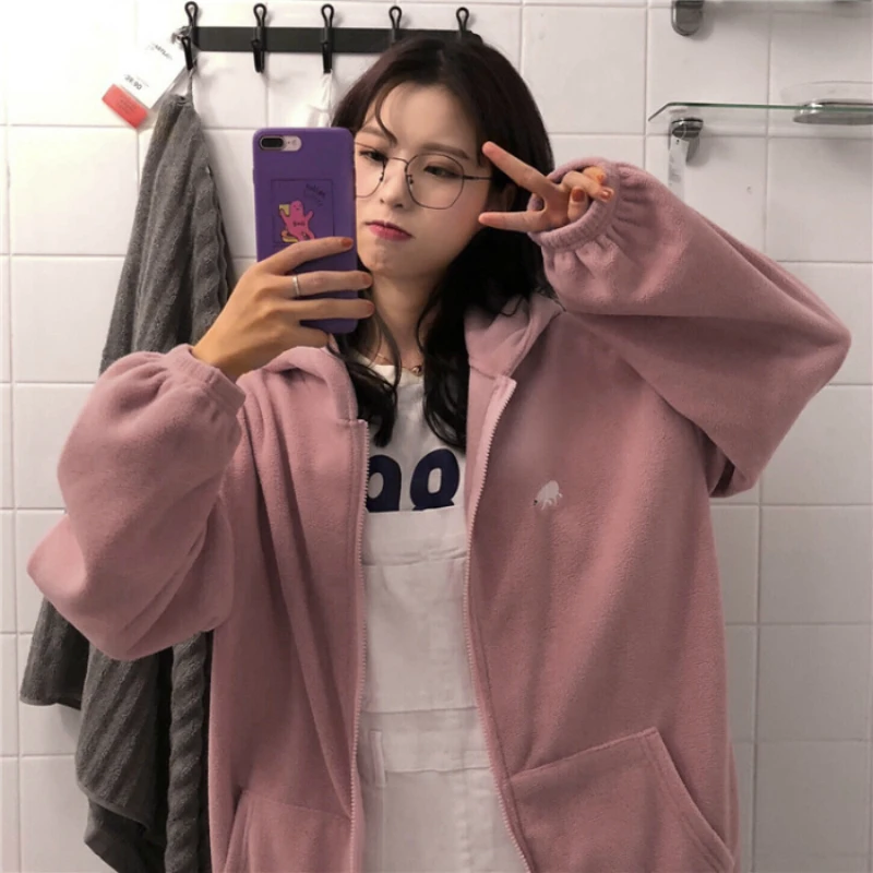 Best Offer New Arrival Harajuku Embroidered Bear Solid Fleece Warm Zip Jacket Hoodies Korean Style Women Sweatshirt With Pockets