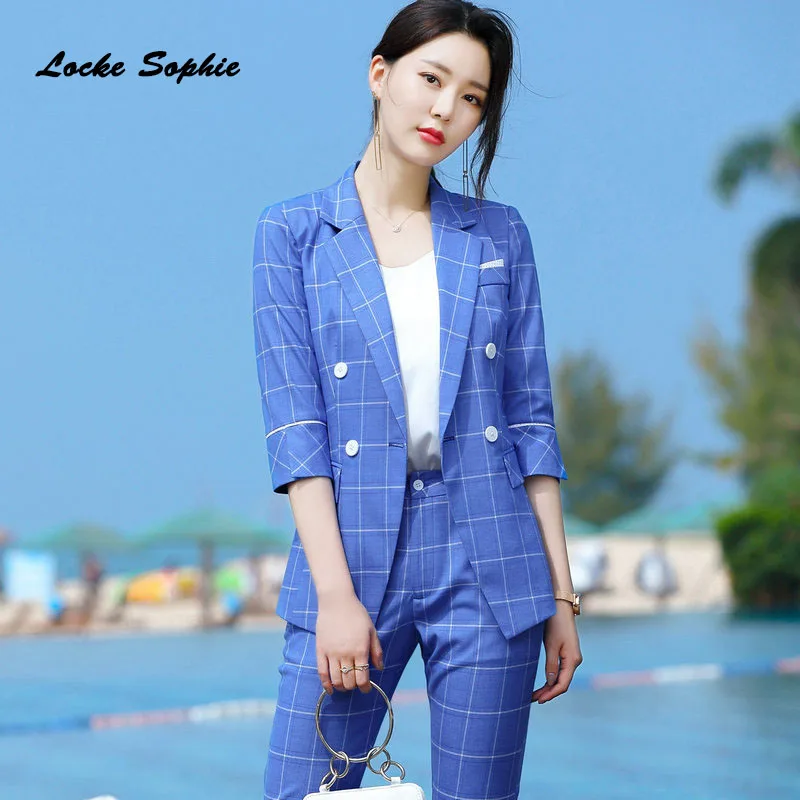 Buy Womens plus size Blazers coats 2020 Spring Cotton blend Button Splicing Slim fit plaid jackets ladies Skinny Small Blazers Suits
