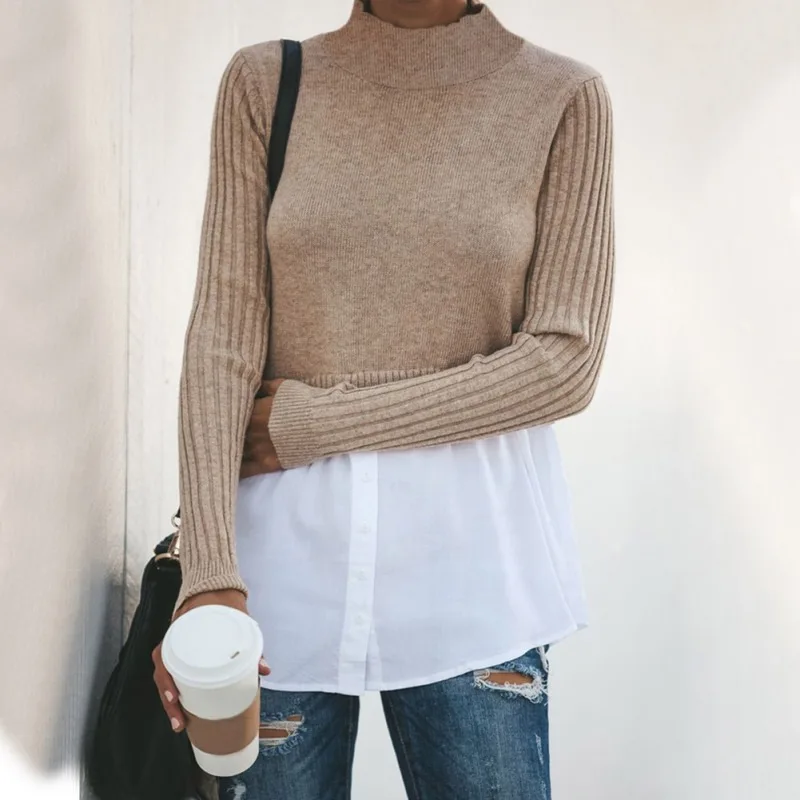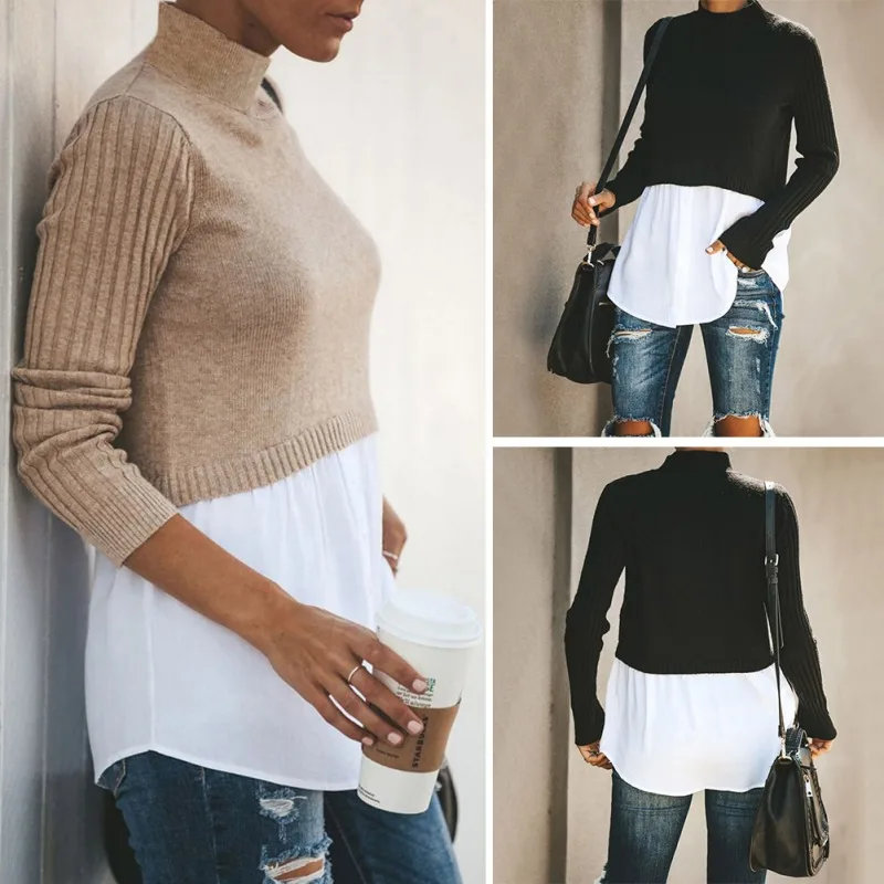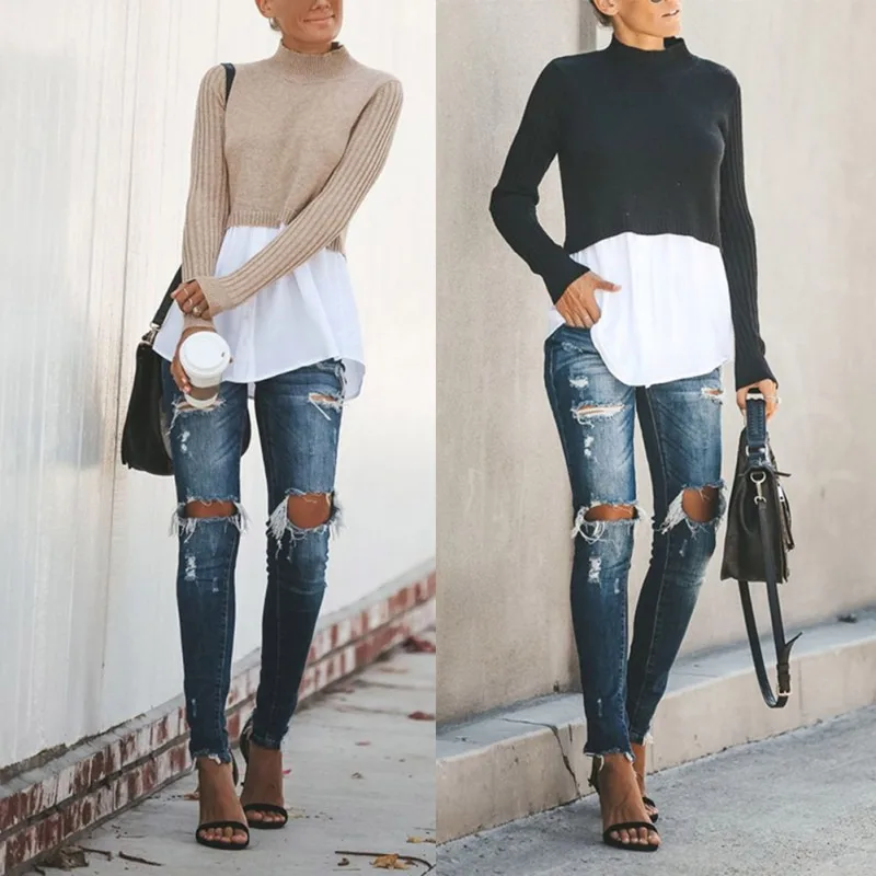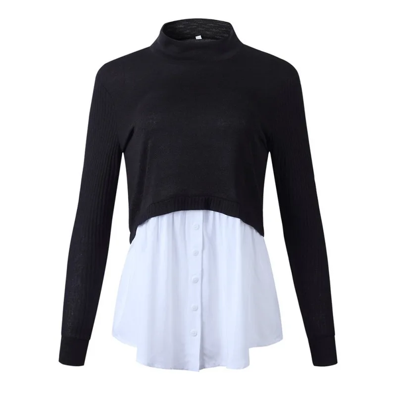 Best Offer Women Tops Autumn Winter Solid Color Slim Long-Sleeved Outerwear Round Collar Bottom Button Knit Stitching Sweater Rk