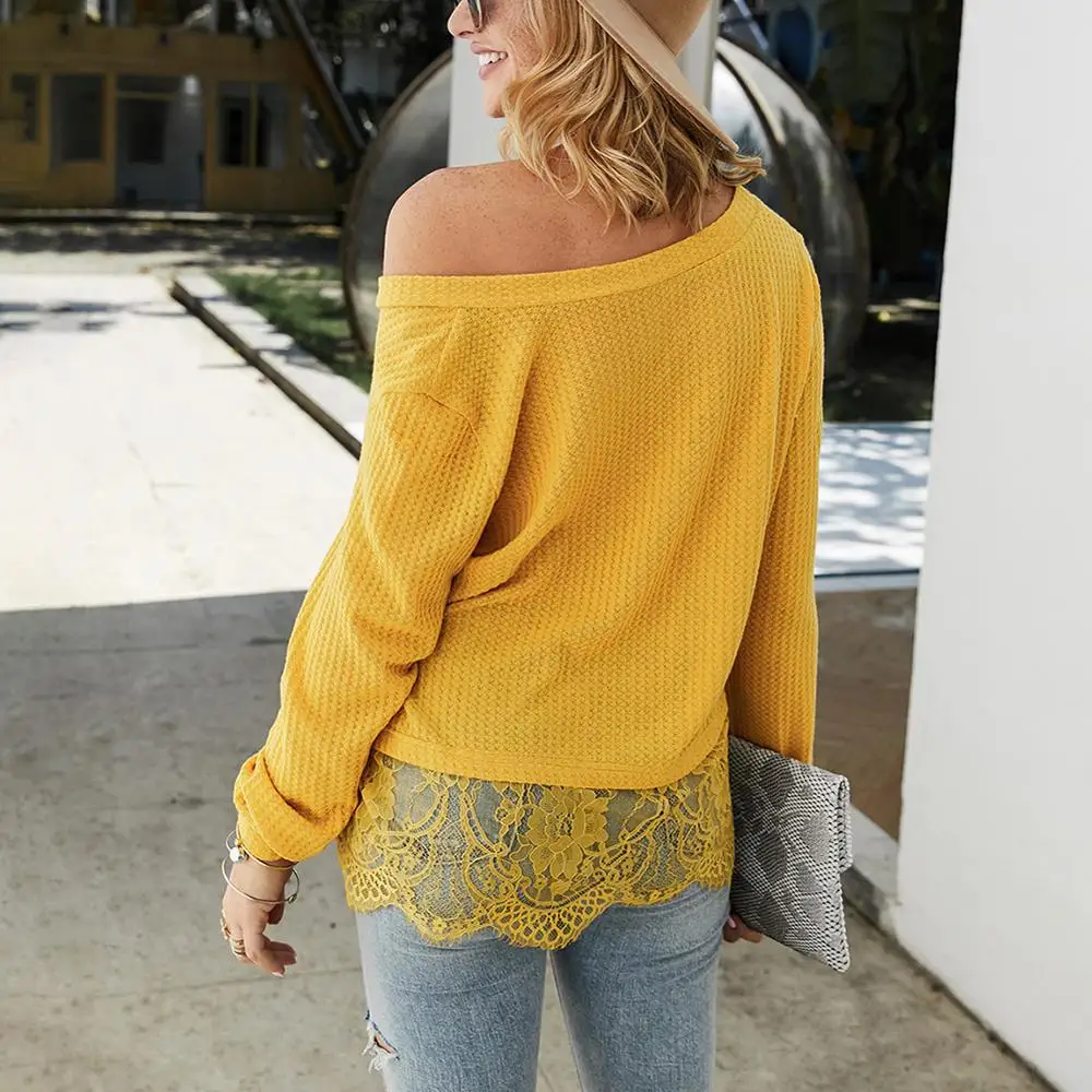 Best Offer Women's V-neck Knitted Sweater Lace Hem Fashion Casual Sweater Women's Sexy Knitted Pullover Autumn and Winter Tops