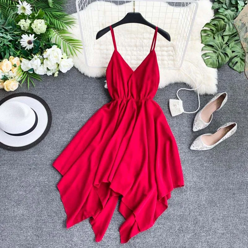 New Boho Style V Neck Sexy Asymmetrical Ladies Summer Midi Dress Women Party Spaghetti Strap Casual Beach Holiday Irregular Vestidos