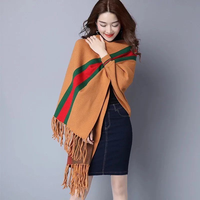 New 2019 Winter Cashmere Tassel Wraps Classic Striped Knitted Sweater Women Batwing Sleeve Streetwear Cardigans Shawl Cloak Sweaters