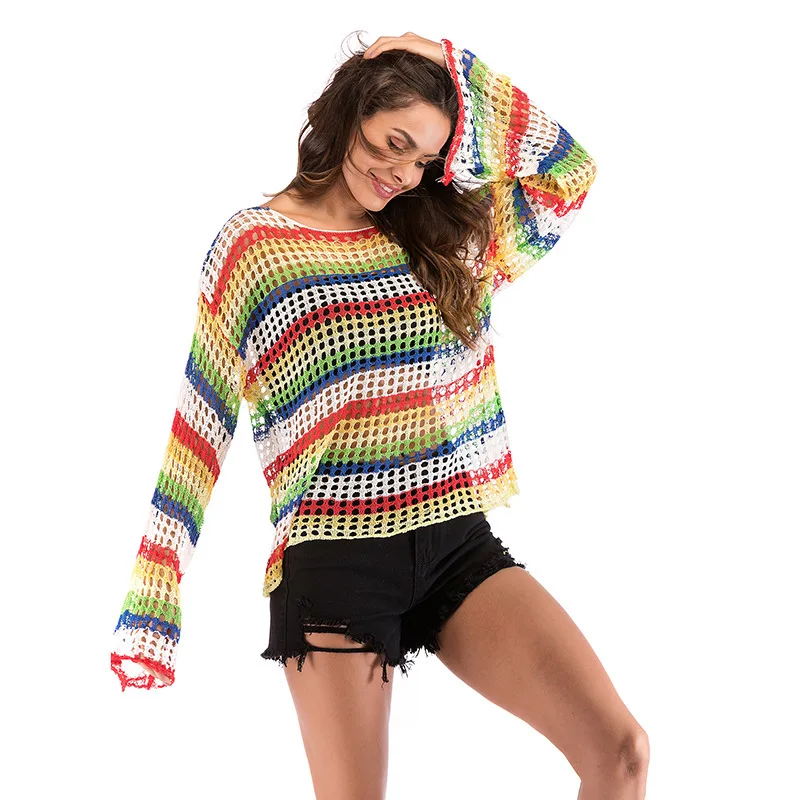 Promo 2020 thin rainbow striped knitted openwork blouse autumn fashion contrast sweater women's loose pullover sweater women