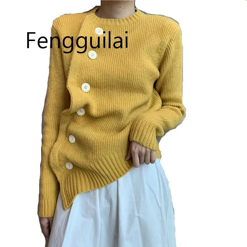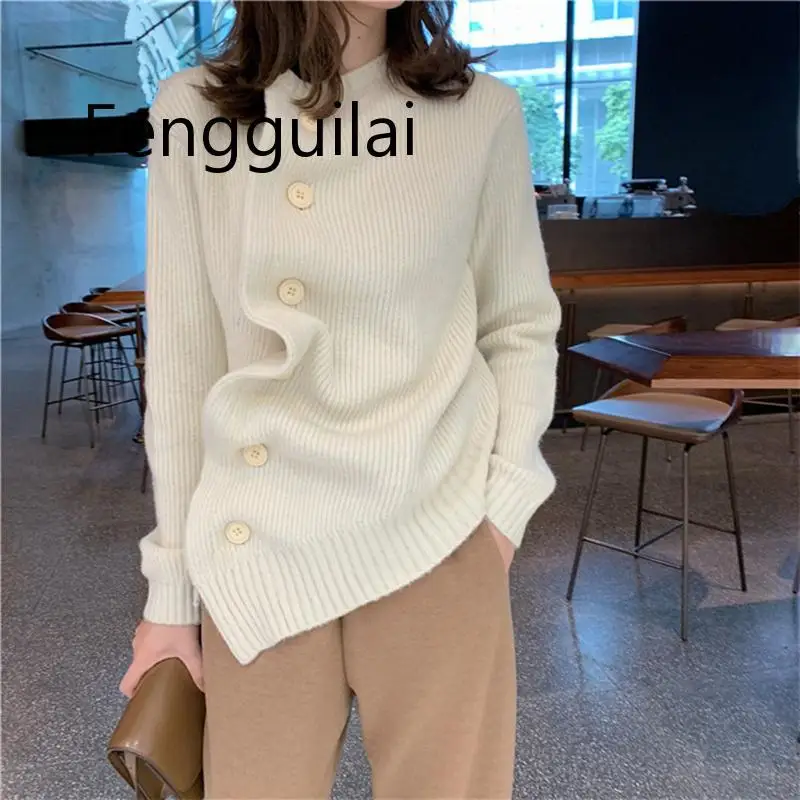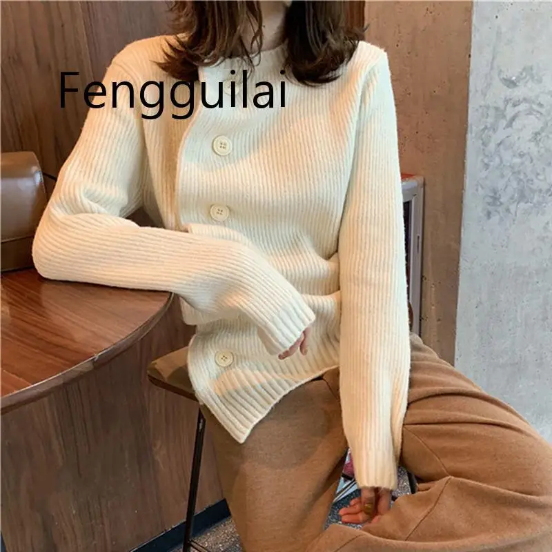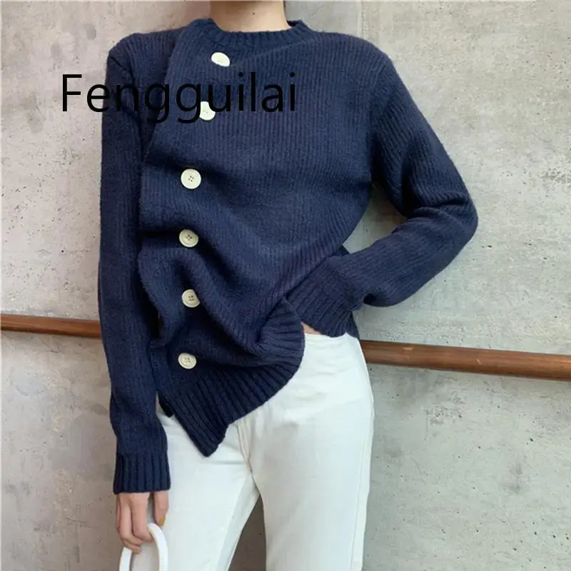 New Vintage Slant Oblique Button Irregular Womens Cardigan Long Sleeve Autumn Winter Loose Sweater Cardigan Tops Trui Dames