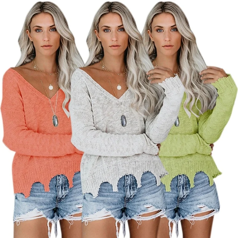 Buy Vicabo Women Sexy V Neck Irregular Hem Knitted Sweater Solid Color Long Sleeve Loose Tops Autumn Spring Casual Sweaters